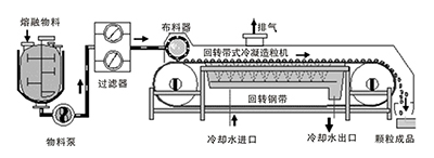 罗特石蜡造粒机是利用熔融液态石蜡从储罐经物料泵和过滤器,到达布料器,布料器通过特殊造粒布料方式将熔融液态石蜡成液滴状一排一排地滴落在其下方匀速运行的冷却钢带上,冷却钢带下方喷有冷却水,钢带上方石蜡液滴经冷却,固化成扁半球状颗粒,由下料刮刀刮下,流入下料斗,从而达到造粒的目的。